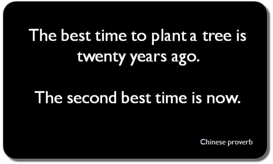 The second-best time is now. Someone is sitting in the shade today because someone planted a tree a long time ago. An old proverb says The best time to plant a tree is 20 years ago.